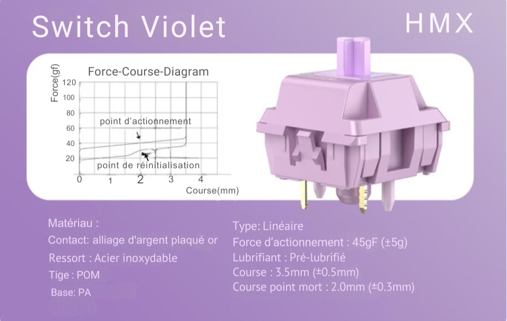 HMX est un fabricant de switch réputé. Avec une force d'actionnement de 45g, le HMX Violet est parfait pour un usage quotidien, car il permet une frappe efficace sans fatigue.