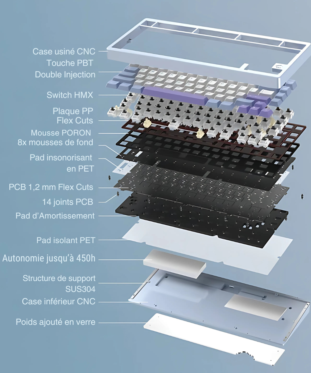 RAINY75 est un des rares claviers à être équipé de 8 couches de mousses amortissantes. Grâce à cela ses touches résonnent comme une goutte d'eau à chaque frappe.